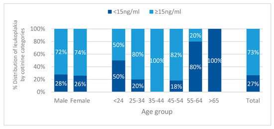 Cotinine categories were associated with the distribution of leukoplakia (p < 0.001, Figure 4). Female participants with serum cotinine 15 ng/mL and above had higher prevalence of leukoplakia when compared to females with cotinine levels below 15 ng/mL (p = 0.007). This association was also statistically significant for the age group 35–44, with all leukoplakia lesions being present in participants with cotinine levels ≥15 ng/mL (p = 0.01).