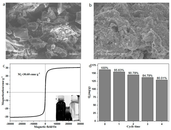 According to Figure 1a, b of the SEM of BC and MBC, it can be seen that the surface of BC is relatively smooth and the pore structure is not completely developed. However, the surface of MBC is relatively rough, with significantly more pores than BC, and the surface is loaded with many nano-iron oxide particles. To test the magnetic strength of the prepared magnetic biochar, the hysteresis loop of MBC was determined at room temperature (298.15 K). The results show that the hysteresis loop of MBC is symmetric about the origin and has obvious superparamagnetism [37]. Its saturation magnetization (Ms) is up to 30.60 emu·g−1. The lower right corner of Figure 1c shows the separation effect of BC and MBC after 1 min of an external magnetic field. It can be found that MBC has excellent magnetic separation ability. Figure 1d shows the adsorption of BPA by a MBC cycle for four times. After a cyclic adsorption for four times, the adsorption capacity of bisphenol A by MBC still reached about 80% of the initial adsorption capacity, indicating that the experimental MBC had a good cyclic adsorption performance. The reason for the adsorption capacity decrease may be that during multiple adsorption–desorption processes, some of the nano-iron oxide particles and active substances on the surface of MBC were eluted, resulting in a decrease of the adsorption capacity. Table 3 shows the adsorption capacity of bisphenol A and the magnetic strength of the magnetic materials prepared in previous literatures.