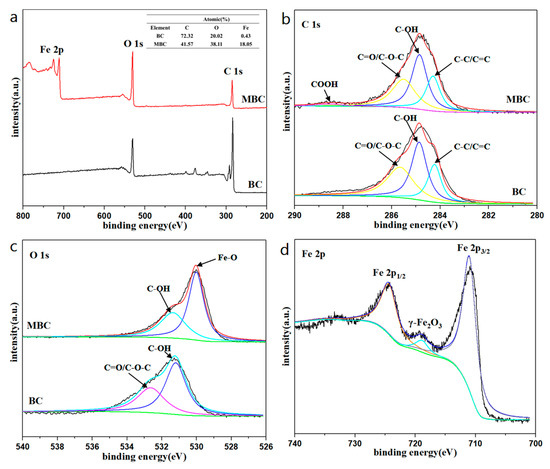 Figure 2 shows the XPS analysis spectrum of BC and MBC. It can be found from the XPS spectrum (a) that the biochar before and after modification has a similar XPS peak shape, and the peak at the binding energy of 284.8 eV corresponds to the C element in BC and MBC. After modification, the strength peak of the C element in MBC is weakened, while that of the O element is enhanced. The C 1s spectrum showed that both the surface of BC and MBC contained a large number of oxygen-containing functional groups, including C-C/C=C, C-OH, C=O/C-O-C, COOH, etc. Compared with BC, the peak area of C-C/C=C decreases, the peak area of C-OH and C=O/C-O-C increases, and COOH appears. This indicates that in the process of magnetic modification, more oxygen-containing functional groups are introduced on the surface of BC. The O 1s spectrum showed that the C element in BC mainly existed in the form of organic carbon (531.75 and 533.02 eV) [43]. The peak area of C-OH and C=O/C-O-C of MBC decreased compared with that of BC, while the peak area of Fe-O increased significantly, and the peak of O element shifted from 531.80 eV to 530.03 eV, closer to the Fe-O peak. This indicates that the introduced Fe is not loaded on the surface of BC in the form of hydroxide. In order to determine the phase of iron oxide, the Fe 2p spectrum of MBC is shown in Figure 2d. The two main peaks at 710.7 eV and 724.3 eV correspond to Fe 2p3/2 and Fe 2p1/2, respectively. The satellite peak at 719.3 eV is the characteristic peak of γ-Fe2O3 [44]. Moreover, the surface of MBC is slightly red. It indicates that the iron oxide supported on the pomelo peel-based biochar is γ-Fe2O3.