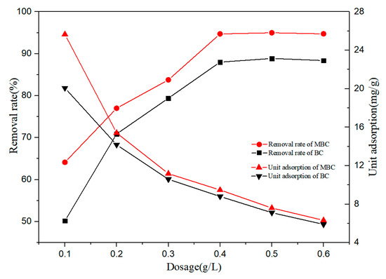The effect of biochar dosage on the adsorption of bisphenol A by BC and MBC is shown in Figure 3. The removal rate of bisphenol A increased with the increase of the biochar dosage. When the biochar dosage was 0.1 g·L−1, the removal rates of bisphenol A by BC and MBC were 50.19% and 64.13%, respectively. When the biochar dosage increased to 0.4 g·L−1, the removal rate increased significantly, 88.01% and 94.74%, respectively. Subsequently, the biochar dosage was increased, and the removal rate remained unchanged. The increased removal rate can be attributed to the increased biochar, which not only increases the effective specific surface area of adsorption, but also increases the active site of adsorption [45]. At the same time, the unit adsorption of bisphenol A by BC and MBC decreased gradually. This is because in the case of limited solutes, too many adsorbents will not only compete for solutes, but also overlap the effective adsorption active sites on the biochar surface [46].