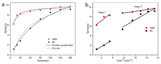 The effect of adsorption time on the adsorption of bisphenol A by BC and MBC is shown in Figure 4a. The adsorption of bisphenol A by the two biochars reached equilibrium at around 150 min. Compared with BC, MBC can reach more than 87% (8.5420 mg·g−1) of the saturated adsorption capacity (9.7098 mg·g−1) within 30 min of the initial adsorption stage, which is significantly faster than BC. In order to further explore the adsorption process of bisphenol A by BC and MBC, pseudo-first-order and pseudo-second-order kinetic models, Elovich model, and the intraparticle diffusion model are used to fit the experimental data. The fitting curve is shown in Figure 4, and the parameter fitting results are shown in Table 4.