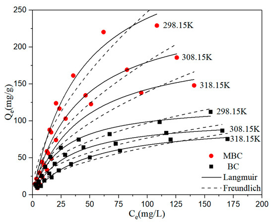The effect of initial BPA concentration on the adsorption of bisphenol A by BC and MBC is shown in Figure 5. With the increase of initial BPA concentration, the adsorption capacity of BC and MBC to bisphenol A also increased gradually. This is because the increased concentration of bisphenol A can enhance the adsorption drive between the adsorbent and the solute [53,54]. Four common adsorption isothermal models are used to further study the adsorption behavior and mechanism. The fitting results are shown in Figure 5, and the relevant fitting parameters are shown in Table 5; Table 6.