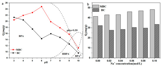 Effects of pH (a) and Na+ concentration (b) on the adsorption of BPA by BC and MBC.