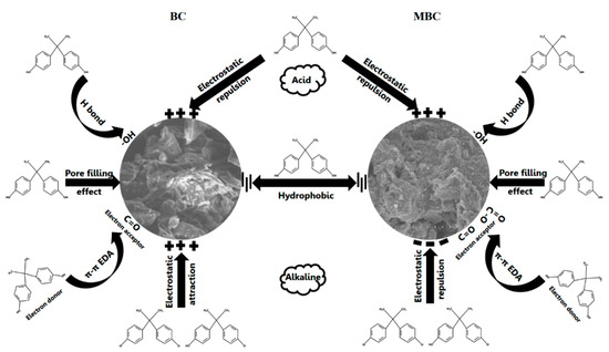 Figure 7 is a schematic diagram of the mechanism of the adsorption of BPA by BC and MBC. The average pore size of BC and MBC is between 2 and 50 nm, which is mesoporous. BPA molecules can enter the pores of BC and MBC through pore filling. As mentioned above, the adsorption capacity of BC and MBC to BPA is greatly affected by pH. Under acidic conditions, the phenolic hydroxyl groups in the structure of BPA protonize, generating electrostatic repulsion with the positively charged surfaces of BC and MBC. The functional group -OH on the surface of BC and MBC also forms strong hydrogen bonds with the -OH and C-H on the molecular structure of BPA. In addition, acidic functional groups of BC and MBC (such as -COOH, C=O, etc.) can act as electron acceptors, forming π–π electron donor–acceptor interactions (EDA) with BPA.