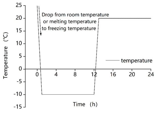 The cured samples were put into an alternating high- and low-temperature test chamber (TC401, Chongqing Taisite Test Instrument Co. Ltd.; temperature range: −40 °C~100 °C) at Chongqing University for the freeze–thaw cycle tests. The freeze–thaw cycles were set to 0 days, 3 days, 7 days, and 14 days, respectively. The one-day freeze–thaw cycle is shown in Figure 2. And as shown, after the sample was placed into the freeze–thaw cycle test chamber, the temperature was dropped from room temperature to −10 °C in one hour. After maintaining this temperature for 11 h, it was then increased to 20 °C within one hour, and this temperature was then maintained for a further 11 h.