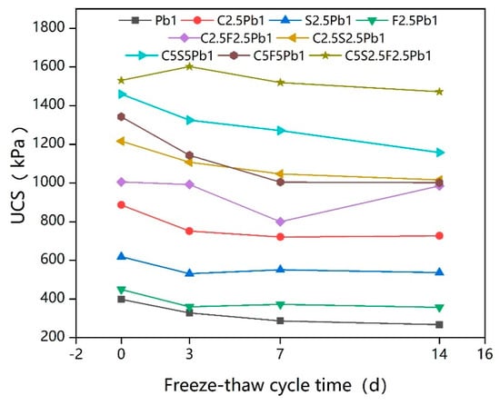 The changes in UCS values of the nine samples based on extensions of the freeze–thaw cycle time fall roughly within two trends, as seen in Figure 4. The first shows the UCS value increasing at the beginning of the freeze–thaw cycle, and then decreasing and eventually stabilizing over the increase of the freeze–thaw cycle time. The UCS of C5S2.5F2.5Pb1 showed this trend, and the increase stage may have contributed to the action of CaO and water, activating the pozzolanic activity of the class F fly ash and forming cementitious gels [], leading to the observed improvement in the UCS of the specimens. Alternatively, it may have attributed to the fact that the various reactions and ion exchanges may not have been completed during the solidification/stabilization process, and the reinforcement effect of the products they produced during the early freeze–thaw cycle on the lead-contaminated soil may have offset the deterioration effect of the freeze–thaw cycle []. However, the change in UCS values of the other eight samples showed a second trend, unlike in the first trend, there was no stage in which the UCS value increased as the freeze–thaw cycle time increased: The UCS value simply decrease with the increase in freeze–thaw cycle time before finally stabilizing. Despite this variation in trends, the conclusion is thus that the freeze–thaw cycle generally reduced the UCS value of the samples [,,].