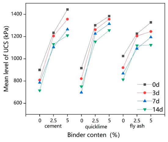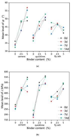 Figure 9a shows that the was affected to varying degrees by the dosages of cement, quicklime, and fly ash. When the freeze–thaw cycle time was 0 days or 14 days, the influencing curves of cement and quicklime were similar; as the dosages increase from 2.5% to 5%, the increase in was less than where the dosages increase from 0% to 2.5%, and the trend for value was approximately linear as the dosages of cement and quicklime increase when freeze–thaw cycle time was 3 days and 7 days. The influencing curve of fly ash demonstrates a highest point at a 2.5% binder dosage under all four freeze–thaw cycles; the optimum content of fly ash for was thus 2.5%. Considering the long-term freeze–thaw effect, the addition of 5% cement and 5% quicklime are better for improving values.