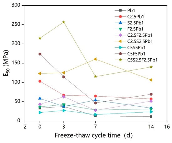 3.2. Influence of Freeze–Thaw Cycles and Binder Dosage on E50