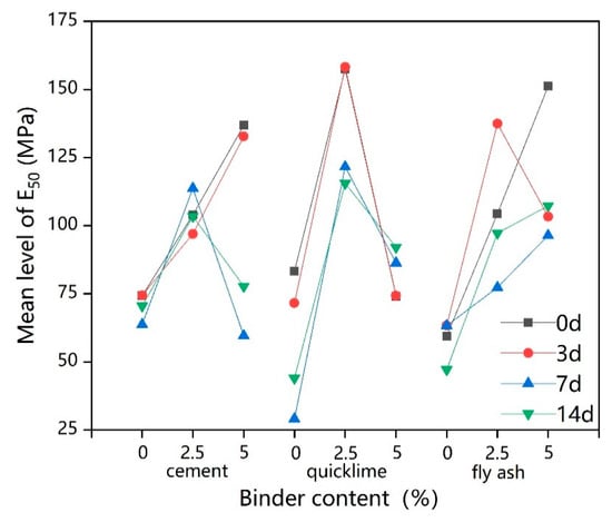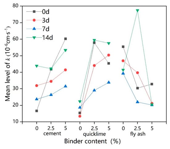 Intuitively from Figure 11, the value continued to increase as the dosages of cement or quicklime increased, while it decreased rapidly with increases in fly ash dosage []. A better level of may thus be achieved by adopting a 5% fly ash, while the dosage of cement/quicklime should be reduced as far as possible.