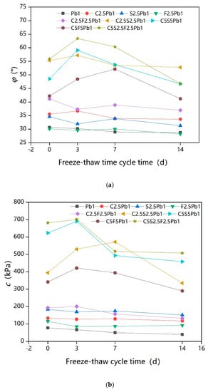 The shear index of solidified lead-contaminated soils under freeze–thaw cycles: (a) The internal friction angle () of solidified lead-contaminated soils under freeze–thaw cycles; (b) The cohesion () of solidified lead-contaminated soils under freeze–thaw cycles.