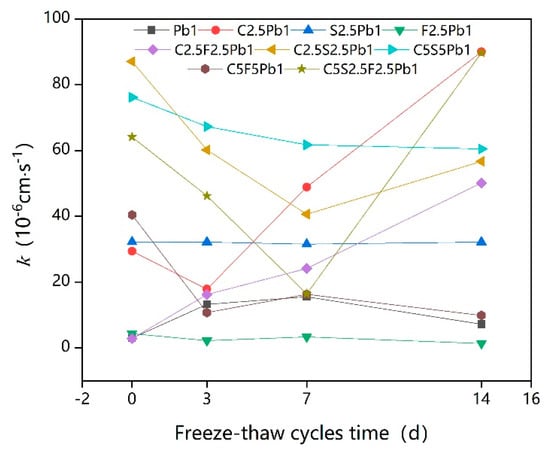 The permeability coefficient of samples without freeze–thaw cycles increased with the increase in the dosage of binder, in contrast to the expected decrease in with the increase in the dosage of binder. A similar result was reported by Kogbara and Al-Tabbaa [], who showed a significant increase in permeability with increasing lime-slag mixed binder dosage. Elrawi and Awad [] further showed that the of lime-stable sandy silty clay increased with increasing lime dosage, which could explain why the value of C5F5Pb1 was smaller than that of C5S5Pb1 and the value of C2.5F2.5Pb1 was smaller than that of C2.5S2.5Pb1. Quigley [] indicated that the adsorption of Pb by soil particles and the adsorption of both by cement occurs during solidification/stabilization, making the distance between the soil particle layers smaller, resulting in further aggregation of soil particles; as a result, the seepage distance increases and the of the solidified/stabilized lead-contaminated soils increases intensely. As the gel-like hydration products of fly ash are minimal compared to those of cement and quicklime, the addition of fly ash did not significantly increase the of lead-contaminated soils. Nevertheless, the value generally increased with an increase in the binder dosage [].