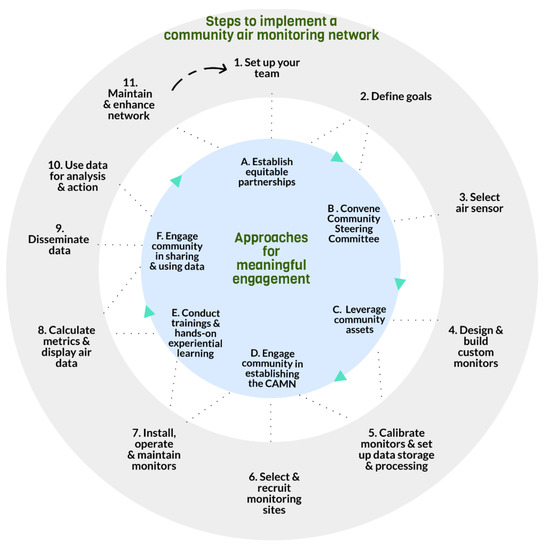 Figure 1 shows a conceptual model for community engagement in implementing a CAMN, from inception to maintenance, based on the Imperial Project. The outer ring of this diagram outlines key steps in the process of implementing a CAMN [34]. These steps include the following: (1) setting up your project team; (2) defining your goals; (3) selecting which sensor to use; (4) designing and building custom air monitors, if using them; (5) calibrating monitors and setting up data processing and storage; (6) selecting and recruiting monitoring sites; (7) installing, operating, and maintaining monitors; (8) calculating metrics and displaying air data; (9) disseminating data; (10) using the data for analysis and action; and (11) maintaining and enhancing the CAMN.