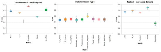 The task addressed in this study is a multiclass classification with respect to the type of visit and two binary classifications for the other two variables (avoiding visit and increased demand). For each text vector representation algorithm five different algorithms were implemented: Random Forest, Gradient Boosting (lightGBM), Fasttext, Multinomial Naive Bayes and Naive Bayes Complement []. Bayesian text classifiers are the most standard algorithms in this setting. A convolutional neural network was also used using the augmented Word2vec vectors. We tested the performance of the algorithms through a stratified 10-fold cross-validation: During 10 iterations/trainings, 9 divisions served as learning and 1 as a test.