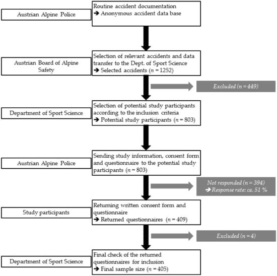 On a weekly basis, the Austrian Alpine Police was informed about the identification numbers of the selected cases in order to send the study documents in print form to the victims by mail. The study documents included an information letter about the study goals and the cooperating institutions, a participant information and consent form, and the questionnaire for data acquisition (details see below). The persons were asked to give written informed consent, to fill in the questionnaire, and to send both back to the Department of Sport Science using the stamped return envelope. Only returned questionnaires with the signed consent form were included for subsequent procedures. Returned questionnaires were checked in order to see if the accidents fulfilled the criteria (i.e., mountain hiking as activity and accident primary caused by a fall) for final inclusion into the study. A fall-related accident was accepted when the person slipped, stumbled, or twisted during mountain hiking (e.g., falls during a stay on a mountain hut were not accepted) which consequently resulted in a fall. In case of missing or ambiguous responses in the questionnaire, study participants were contacted by e-mail or phone to complete data from the questionnaire. This procedure was applied and has been proven in previous studies [2]. The flow chart in Figure 1 illustrates the procedure of accident inclusion, participant responses, and selection of the final sample size included into analyses.
