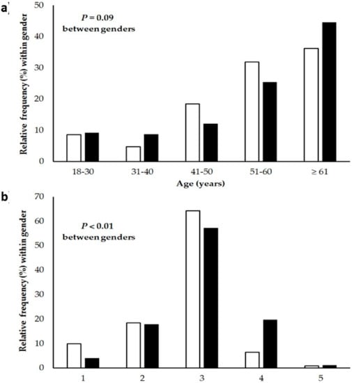 Data of 405 victims, 232 (57%) females, and 173 (43%) males, were included in the analyses. They were of German (79%) or Austrian (21%) nationality. Characteristics of the victims and circumstances of the accidents are shown in Table 1. A gender-specific distribution of age groups is shown in Figure 2a. Victims with defective vision were about 7 years older compared to persons without (58 ± 14 versus 51 ± 16 years, p < 0.01). Among the persons wearing a backpack, the average backpack weight was 5.6 ± 4.2 kg in females and 7.0 ± 3.8 kg in males (p < 0.01 between genders, n = 314). However, relative backpack weight (calculated as backpack weight/body weight × 100) did not differ between female (9% ± 7%) and male victims (9% ± 5%; p = 0.94 between genders). When focusing on the persons wearing a backpack (n = 334), 60% used hiking sticks; backpacks of these individuals were about 40% heavier compared to the individuals not using hiking sticks (7.4 ± 4.0 versus 5.2 ± 3.9 kg, p < 0.01). With respect to the whole sample, about 7% wore running shoes, trainers, or sneakers, 18% flat hiking shoes with a profiled sole, 61% ankle-height hiking shoes with a profiled sole, 12% ankle-height mountaineering boots with a rigid sole suitable for use with crampons, and 1% other types of shoes with significant differences between genders (Figure 2b).