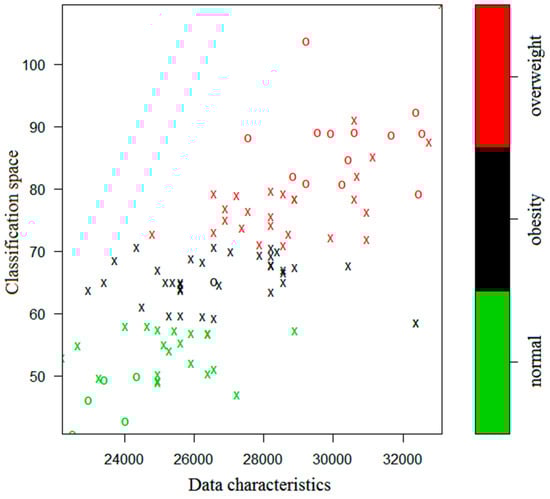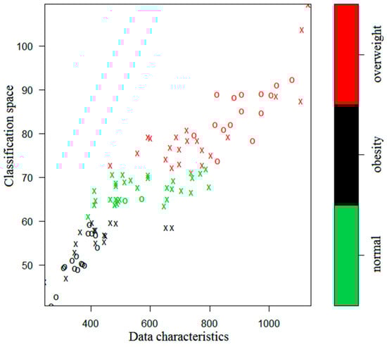 Figure 4, where the green, black, and red colors indicate the normal, obesity, and overweight subjects, respectively.