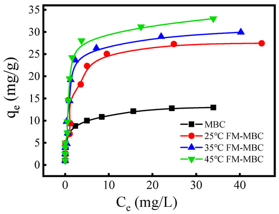 The adsorption isotherm of the MBC and FM-MBC for Cr(VI) (Figure 5), which indicated that the adsorption capacity of Cr(VI) rapidly increased, with increase in temperature at the equilibrium Cr(VI) concentration less than 10 mg/L. When the equilibrium concentration of Cr(VI) was greater than 10 mg/L, the adsorption capacity of Cr(VI) slowly increased. It may be due to the adsorbent not attaining adsorption saturation when the equilibrium concentration was lower and the adsorption reaction occurring on the surface of the adsorbent. The amount of Cr(VI) adsorbed increased from 0.20 to 28.31, 9.78 to 31.02, and 9.83 to 37.54 mg/g when the Ce(Cr(VI)) was increased from 0.01 to 43.52 mg/L, at 25, 35, and 45 °C, respectively. As the temperature increased from 25 to 45 °C, the amount of Cr(VI) adsorbed increased from 28.31 to 37.54 mg/g, indicating that increasing temperature was beneficial to Cr(VI) removal, and FM-MBC exhibited a Cr(VI) adsorption capacity higher about one point five times than that of MBC.