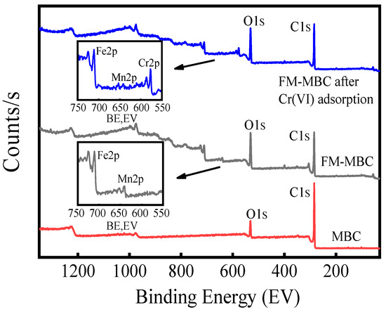 XPS spectrum of MBC and FM-MBC before and after adsorption Cr(VI) were shown in Figure 9. The photoelectron signals of MBC were C1s (284.05 eV) and O1s (531.52 eV). The photoelectron signals of FM-MBC and FM-MBC after Cr(VI) adsorption were C1s (284.40 eV), O1s (530.80 eV), Mn2p (640.90 eV), and Fe2p (710.50 eV). Because the strength of XPS is related to the content of elements, the content of Mn in FM-MBC before and after adsorption in Table 3 is only 6.42–7.62 wt. %, so the peak of Mn in XPS is not obvious. The peak center at 576.7 eV (spectrum FM-MBC after Cr(VI) adsorption) is due to the Cr2p, indicating that Cr(VI) was absorbed onto FM-MBC. This result was consistent with the results of FT-IR spectra of FM-MBC and the results of Yu et al. [48].