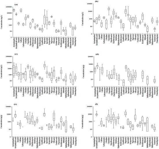 With the exception of sulfamethazine, 26 types of substances were detected at a frequency of at least 50%, and 12 were detected with 100% frequency. Ibuprofen, cimetidine, acetaminophen, and acetylsalicylic acid were detected at concentrations of 1000 ng/L or more, and 13 types of substances including caffeine, ofloxacin, and iopromide showed a concentration range of 100–1000 ng/L (Figure 1c).