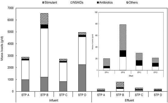 The pharmaceuticals detected in the target STPs were classified into four types, namely stimulants, NSAIDs, antibiotics, and others, in order to assess their relative distributions and mass loads by use (Figure 2). The mass loads of NSAIDs in the influent were 1624 g/d for STP A, 4109 g/d for STP B, 1604 g/d for STP C, and 2329 g/d for STP D. The relative distributions of the four types of pharmaceuticals mentioned above were 56%, 63%, 59%, and 47%, respectively, with NSAIDs showing a much higher relative distribution than the other types. STP B had a higher mass load than the other STPs, as its flow rate was 1.7–1.9 times higher. The relative distribution of STP C, which had the lowest NSAID mass load, was the second highest after STP B. We observed no relationship between mass load and relative distribution. A previous study also investigated the relative distributions of 15 types of pharmaceuticals in WWTPs; six types of analgesics and NSAIDs showed the highest relative distributions (70% or more) []. The mass load of NSAIDs among the effluents was the highest at 231 g/d in STP B, and ranged from 36–231 g/d in the four STPs. In the case of NSAIDs, the effluent mass load decreased by at least 94% when compared with the influent mass load in the four STPs; however, as the influent mass load was much higher for NSAIDs than for other substance types, their relative distribution in the effluent was also high.