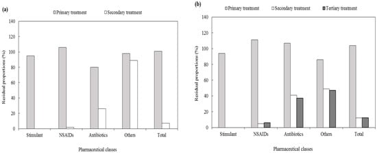 Figure 3 shows the residual proportions of pharmaceuticals in the various unit processes of the STPs. In each STP, the total mass load of the primary effluent increased by 1%–10% compared with the total influent mass load; similar to the characteristics of the influent, the mass loads of the solid phase were insignificant. The mass loads of NSAIDs in the primary effluent increased by 6%–26%. Ibuprofen had a maximum mass load of 893 g/d at STP D whereas that of acetaminophen was 3567 g/d at STP B; in each of the four STPs, the mean increase was at least 27% and 16%, respectively. The mass load of antibiotics decreased by 20% in STP A and 10% in STP D through the primary treatment, but increased by 7% in STP B and 29% in STP C. Among the antibiotics that showed an increase in the mass load in the primary effluent, the mass load of cefradine increased from 170 g/d to 186 g/d and that of roxithromycin increased from 21 g/d to 25 g/d in STP B; the mass load of cefradine increased from 38 g/d to 62 g/d and that of clarithromycin increased from 35 g/d to 38 g/d in STP C. Similarly, Ashfaq et al. (2017) investigated the behavior of 49 types of pharmaceuticals and personal care products in STPs using the A2O process, and reported that the mass loads of certain substances such as NSAIDs and antibiotics were higher in the effluent passing through the screens and rotating grit chamber than in the influent []. In contrast, in STP B, iopromide decreased from 606 g/d to 475 g/d and ciprofloxacin decreased from 13 g/d to 10 g/d; in the four STPs, they decreased by 14%–29% and 5%–22% through primary treatment, respectively. The total mass load of the secondary effluent was 193 g/d for STP A, 785 g/d for STP B, 313 g/d for STP C, and 251 g/d for STP D. The residual proportion of the secondary effluent was 7% in STP A, 12% in STP B, 11% STP C, and 5% in STP D, which was a reduction of 88%–95% when compared with the influent mass load. In the MBR process of STP A, SS were completely removed after membrane filtration; as a result, all the pharmaceuticals were present in the liquid phase. Most SS were contained in the liquid phase in the other treatment plants as well. In the case of effluent subject to tertiary treatment, the total mass loads were 789 g/d at STP B, 297 g/d at STP C, and 212 g/d at STP D. The residual proportion of the effluent was 12% in STP B, 11% in STP C, and 4% in STP D. STP A was not considered because the substances were discharged from this plant without further treatment after biological treatment. Despite the low concentration of SS in the effluent, certain pharmaceuticals were found in the solid phase; however, most were distributed in the liquid phase, as was the case for the effluent subject to biological treatment.