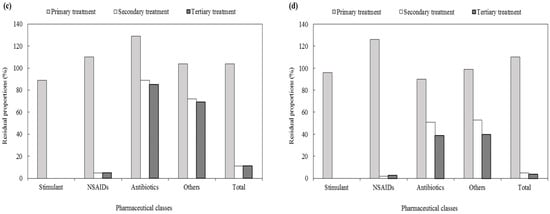 Residual proportions of pharmaceutical classes in each treatment process of the STPs. (a) STP A, (b) STP B, (c) STP C, (d) STP D.