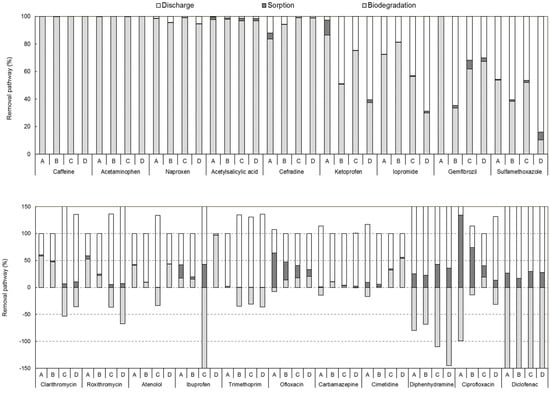 where Minfluent (g/d) = flow rate (m3/d) × influent concentration of each pharmaceutical (ng/L) × 10−6; Meffluent (g/d) = flow rate (m3/d) × effluent concentration of each pharmaceutical (ng/L) × 10−6; Msorption (g/d) = sludge production rate (m3/d) × sludge concentration of each pharmaceutical (ng/L) × 10−6; and Mbiodegradation (g/d) was calculated from the mass loads of the influent, effluent, and sorption.