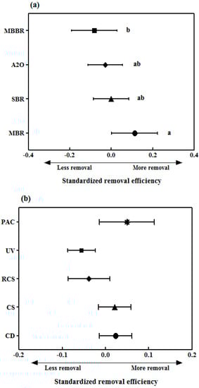 Comparison of standardized removal efficiencies (SREs) (mean ± 95% CI) of pharmaceuticals in different treatment processes. (a) Biological treatment processes and (b) tertiary treatment processes. A significant difference (p < 0.05) between SREs of different treatment processes is represented by alphabets, based on ANOVA with Tukey post-hoc test. MBR: membrane bioreactor, SBR: sequencing batch reactor, A2O: anaerobic–anoxic–oxic, MBBR: moving-bed biofilm reactor, CD: coagulation/disk filter, CS: coagulation/sedimentation, RCS: rapid coagulation-sedimentation, UV: ultraviolet, and PAC: powdered activated carbon.