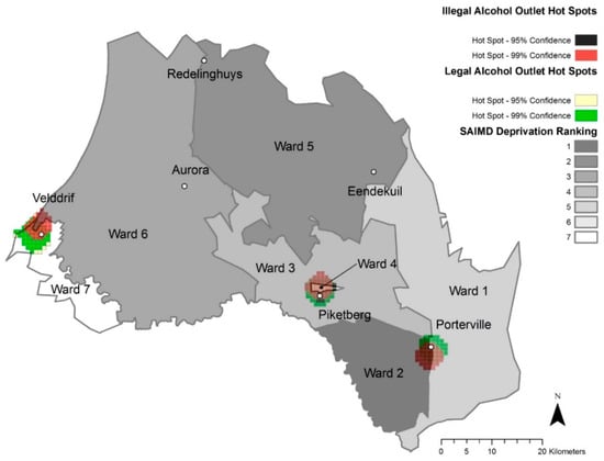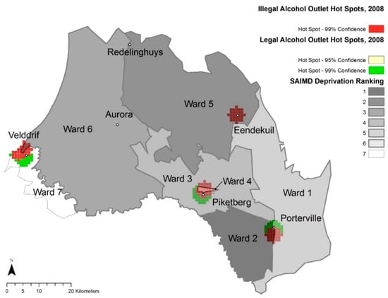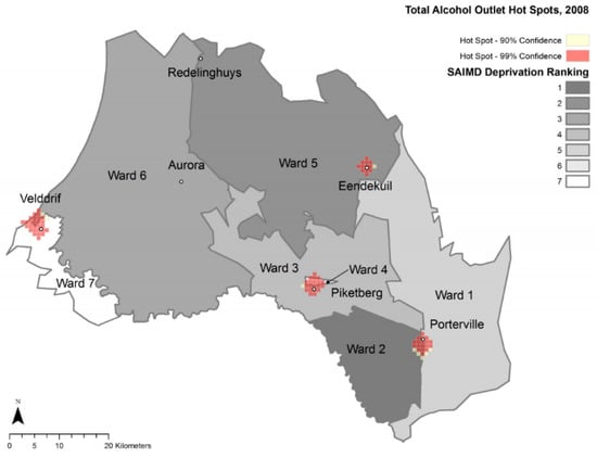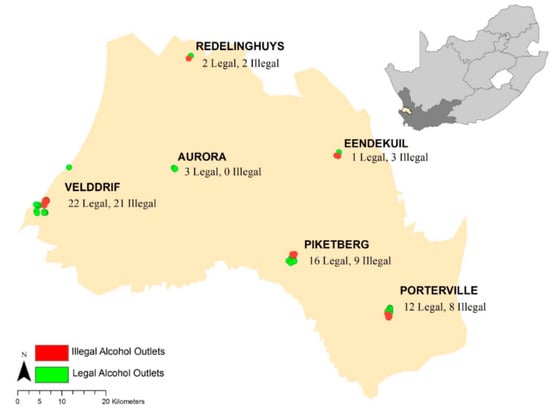 - Bowers, Y.; Rendall-Mkosi, K.; Davids, A.; Nel, E.; Jacobs, N.; London, L. Liquor outlet density, deprivation and implications for foetal alcohol syndrome prevention in the Bergriver municipality in the Western Cape, South Africa. S. Afr. Geogr. J. 2014, 96, 153–165. [Google Scholar] [CrossRef]