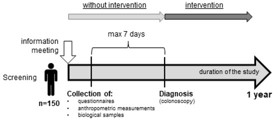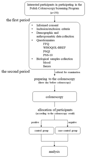 The study will be performed within the framework of the Polish Colonoscopy Screening Program. Men and women aged between 50 and 65 (n = 150) will take part in the study. This age group was chosen for the study because according to the literature adults over the age of 50 are marked as an increased risk group of CRC development [8,9]. The subjects will be recruited from among the patients of the Department of Gastroenterology of the Provincial Specialist Hospital in Olsztyn at least one month before the study. Within the study, 150 participants age between 50 and 65 will be invited to participate in the experiment. Participants will be excluded from the study if they are under 50 and over 65 years old, requiring long-term care due to somatic, mental retardation or other mental illness, or with a history of colorectal resection. The experiment will be divided into two periods (Figure 1). The first period (without intervention) will be one week before the second period (intervention—colonoscopy). During the first period participants will be invited to the Department of Human Nutrition, Faculty of Food Sciences, University of Warmia and Mazury in Olsztyn in order to collect the demographic and anthropometric data, collect the biological samples (blood and feces), and complete the questionnaires (food frequency questionnaire (German EEPIC FFQ2), the questionnaire of The World Health Organization Quality of Life (WHOQOL-BREF), The Pittsburgh Sleep Quality Index (PSQI), and the Perceived Stress Scale (PSS-10)). During the second period of the experiment, the participants will be referred for a colonoscopy. However, the endoscopic examination will take place no later than one week after the end of the first phase. The subjects will be asked to prepare for the colonoscopy, which involves cleansing the intestine from food leftovers. For this purpose, the preparation of Fortrans® will be used. Preparations for a colonoscopy also include diet restrictions such as three days before the colonoscopy, the participants should exclude from their daily diet baked products with grains, stone fruits (for example grapes, tomatoes, kiwi, strawberries), and linseed, poppy and sesame seeds; the day before the colonoscopy a light breakfast, cream soup for lunch, and liquids (water, tea, juices) will be recommended; and on the day of the examination only liquids are allowed (water, tea, juices), up to two hours before the scheduled colonoscopy. According to the colonoscopy results, the participants will be assigned to one of two groups. The schematic course of the experiment is shown in Figure 2.