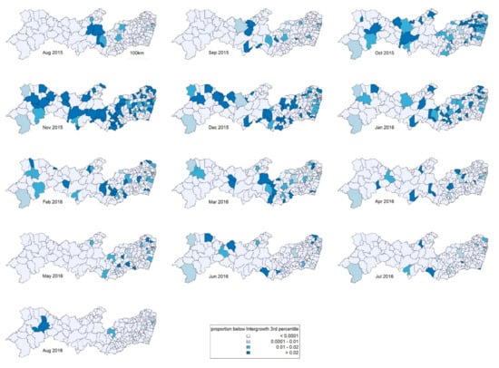 The number of live births in each month in each municipality was estimated from the number of live births in the corresponding month and municipality in 2013, from the national Live Birth Information System (SINASC, Sistema de Informações sobre Nascidos Vivos) of the Ministry of Health. Some municipalities had zero births for some months, so the denominator was smoothed, by taking it to be the average of the original value with the two values from months adjacent in time and then rounding to the nearest integer.