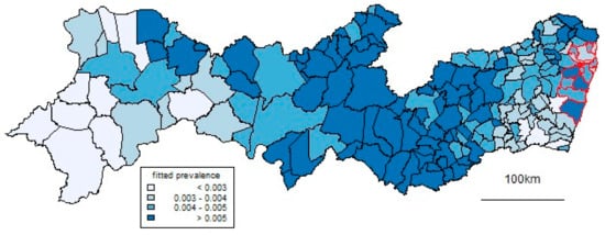 In terms of time, the peak was in November 2015. In terms of space, as well as high proportions in the Recife Metropolitan Region, high prevalences occur in a north–south band about 300 km inland. Figure 4 and Figure 5 show results from the spatiotemporal CAR model used to smooth the data. Figure 4 shows the month in which the fitted prevalence first passed 1 in 500 births. This occurred early in some coastal municipalities in the RMR but also, notably, in the same north–south inland band. Figure 5 shows corresponding patterns of prevalence over all the study period, which generally reflect those of Figure 4. Over a substantial part of the state, this overall prevalence was over 0.5%.