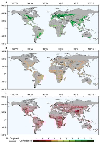 - At the national scale: the proportion of high coincidence in the countries that had vast land areas and complex agricultural conditions (such as Russia, the United States, and China) was always less than 50%, except for India. The countries with moderate total cropland amount and good agricultural conditions, such as Poland and Ukraine, had the highest proportion of high coincidence, which exceeded 80%. The high coincidence in most countries in West Asia, sub-Saharan Africa, and Northern Europe with relatively harsh agricultural conditions was generally less than 20%.