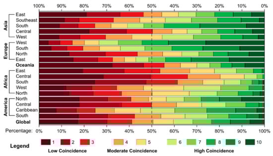 - At the subcontinental scale, the proportion of high coincidence in South Asia and most European regions (except for North Europe) had reached 50%; it performed the worst in central Africa, only 9.0%; the proportions in the other subcontinental regions were usually approximately 30%. The regions with a proportion of poor coincidence over 50% were West Asia and all subcontinental regions in Africa; those of most other regions were approximately 30%–40%, and Western Europe had the smallest proportion, only 14.8%.