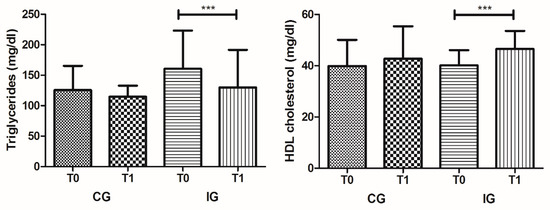 HDL cholesterol and triglycerides serum levels in CG and IG at T0 and T1 moments (*** p < 0.001).