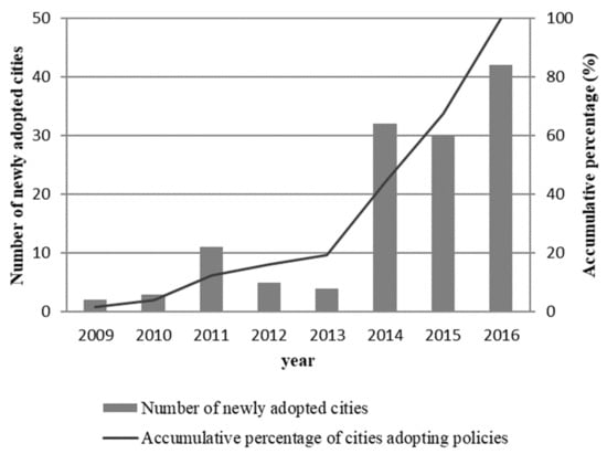 Encouraged by the central government’s policies, many provincial and municipal governments also started to use financial instruments to subsidize NEV manufacturing companies and purchasers. Table 1 shows the number of cities that recently adopted financial subsidy policy for NEVs. And Figure 1 shows the diffusion of the local financial subsidy policies for NEVs in China from 2009 to 2016. Only two cities adopted a local financial subsidies policy for NEVs in 2009. Since then, the number of cities adopting policies has increased steadily. Eleven new cities adopted financial subsidy policies in 2011. Since 2014, no fewer than 30 cities adopted the policy every year. This illustrates a rapid diffusion pattern among local governments in the adoption of a financial subsidy policy for NEVs.