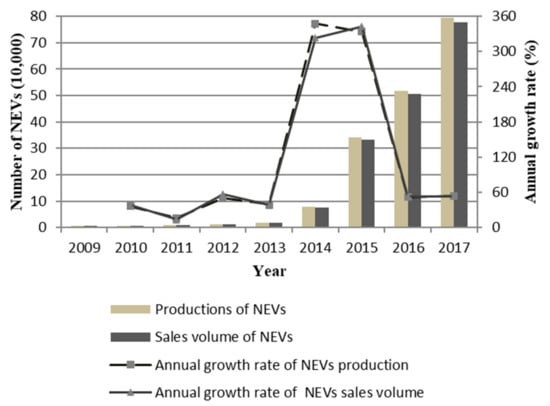 With the support of government policies, the productions and sales volume of NEVs in China is also growing rapidly. Figure 2 shows the productions, sales volume, and annual growth rate of NEVs in China from 2009 to 2017, the data for which were obtained from the official website of the China Association of Automobile Manufacturers.