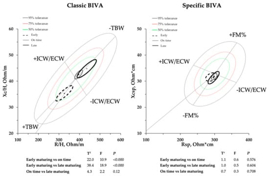 Therefore, the main purpose of the present study was to assess BC using classic and specific BIVA, identifying the differences in BC, particularly in TBW (classic BIVA) and in FM% (specific BIVA), due to the influence of somatic maturation. The second aim was to provide specific R-Xc graphs for male elite youth soccer players. We hypothesized that BIVA patterns are differentiated among athletes according to whether or not they mature earlier, on-time, or late.