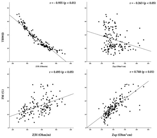 The classic impedance vector (Z/H) was negatively associated with TBW (L), while the specific impedance vector (Zsp) was more strongly and positively associated with FM% (Figure 2).