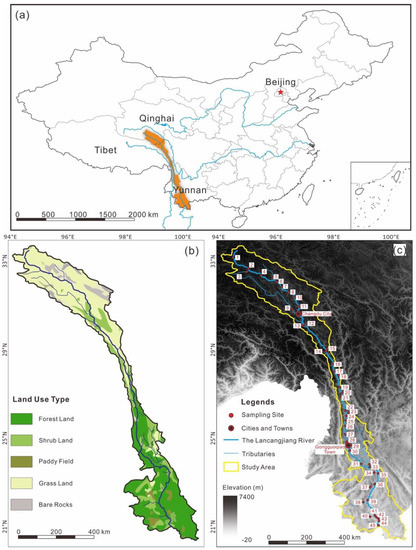 The Lancangjiang River covers six climatic zones from north to south: frigid zone, cold temperate zone, temperate zone, warm temperate zone, subtropical zone, and tropical zone [33,34]. The average annual precipitation in the Lancangjiang River basin is more than 1200 mm, with <800 mm in the upstream, 800–1100 mm in the midstream, and >1100 mm in the downstream [34,41]. From the land-use map (Figure 1b), grassland and bared rocks are distributed in the north, while forest land and a little proportion of paddy land are distributed in the south, and shrub land spreads within the whole drainage basin. The land used by human activities are focused in the downstream [40].