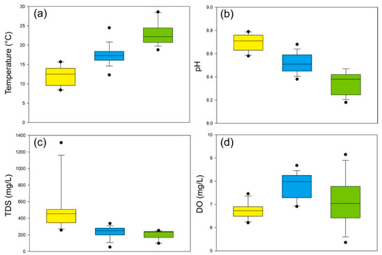Boxplots of the chemical parameters of the Lancangjiang River: (a) temperature; (b) pH; (c) total dissolved solid (TDS); (d) dissolved oxygen (DO).