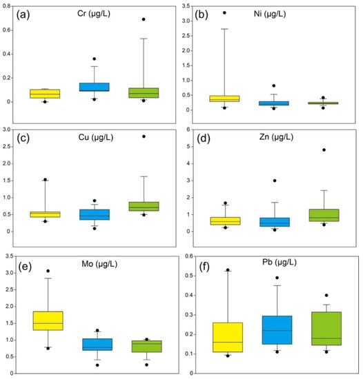 The boxplots of dissolved heavy metals are displayed in Figure 3. Dissolved Ni and Mo are similar in spatial distribution, with the highest values in the upstream and lowest values in the midstream. The similarity was also shown in the distribution of dissolved Cr and Pb, with the highest mean values in the midstream and lowest values in the upstream. Dissolved Cu and Zn are abundant in the downstream and depleted in the upstream.