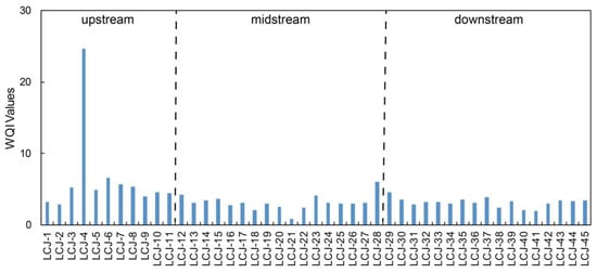 The water quality was assessed using WQI values calculating based on the weights of dissolved Cr, Ni, Cu, Zn, Mo, and Pb (Table 5), but the weight of dissolved Pb was unavailable because there are no loadings of Pb for any PCs. The results of WQI are shown in Figure 4. Water samples within the drainage basin had an excellent quality with WQI values under 50, indicating these dissolved heavy metals posed no health risks to human health. However, the water quality in the upstream was worse than in midstream and downstream, which may be attributed to the lack of water management due to the sparse population [33,34,40]. The high WQI value at site LCJ-4 might be affected by largely natural inputs due to the high concentration of dissolved Ni and Mo.