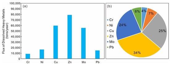Based on the average discharge data of the Lancangjiang River, the flux of each dissolved heavy metal is shown in Figure 6. Annually, the Lancangjiang River transported dissolved Cr, Ni, Cu, Zn, Mo, and Pb into the Mekong River, with the amounts of 8.93 × 103, 1.65 × 104, 5.98 × 104, 7.91 × 104, 5.57 × 104, and 1.51 × 104 tons/year, respectively (Figure 6a). Among the dissolved heavy metals, dissolved Zn, Cu, and Mo occupied the main proportion, with the percentage of 34%, 25%, and 24%, respectively (Figure 6b). Considering that Zn from agricultural activities were concentrated in the downstream, it might contribute to the Mekong River, pose potential risks, and needs more attention.