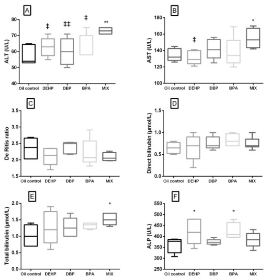 Liver-related serum biochemical parameters after 28 days of oral exposure to single investigated substances and their mixture (MIX). Each box plot represents interquartile range (25–75th percentile), the line within the box represents median value, and ends of the whiskers represent the minimum and maximum values within the group. (A) ALT activity (U/L), (B) AST activity (U/L), (C) the De Ritis ratio (AST/ALT), (D) direct bilirubin concentration (μmol/L), (E) total bilirubin concentration (μmol/L), (F) ALP activity (U/L) ((DEHP, DBP and BPA) * p < 0.05, ** p < 0.01 (compared to the control), ‡ p < 0.05, ‡‡ p < 0.01 (compared to the MIX group).