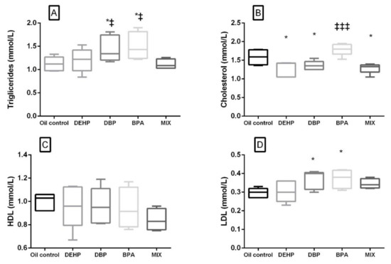 Lipid profile after 28 days of oral exposure to single investigated substances (DEHP, DBP, and BPA) and their mixture (MIX). Each box plot represents interquartile range (25–75th percentile), the line within the box represents median value, and ends of the whiskers represent the minimum and maximum values within the group. (A) Triglycerides (mmol/L), (B) cholesterol (mmol/L), (C) HDL (mmol/L), (D) LDL (mmol/L). * p < 0.05 (compared to the control), ‡ p < 0.05, ‡‡‡ p < 0.001. (compared to the MIX group).