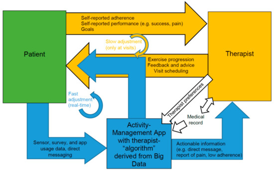 Mobile rehabilitation (mRehab) using sensor-enhanced activity management (SEAM). The orange-colored loop represents the conventional approach to adjusting home exercise programs. The therapist interviews the patient and performs assessments at clinic visits, then adjusts exercise progression and provides feedback and advice. A SEAM platform implements the blue-colored loop, using sensor data to more objectively track patient adherence and performance in real-time. Large amounts of unreduced data are of little value to therapists, so we propose that it is essential for SEAM platforms to use big data analytics (BDA) to develop a therapist-like “algorithm” that can adjust exercise progression and provide simplified feedback to the patient and therapist (via an activity-management app), consistent with the therapist’s and patient’s preferences and intentions. Our working hypothesis is that adding the BDA-enabled SEAM loop to the conventional adjustment loop will increase patient compliance and enable more optimal delivery of home rehabilitation.