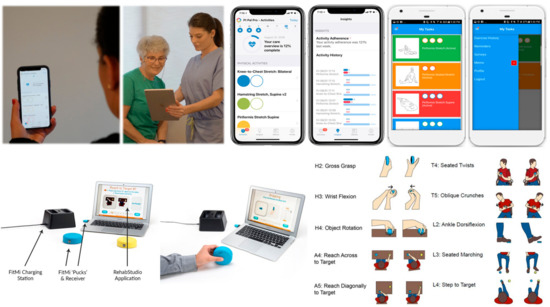 Pt Pal (Figure 2, top row) is a cloud-based patient engagement platform that enables clinicians to manage patients between visits at home by sending treatment plans, therapies, activities and reminders to the patient’s mobile device. Pt Pal also supports clinical assessments, compares results against other outcomes data, provides active reminders, and incorporates both stock and custom video examples. FitMi (Figure 2, bottom row) is a sensor-based solution for gamification of home-based rehabilitation exercise. FitMi consists of two hockey-puck-like devices (“motion interfaces”) that sense force and motion and connect wirelessly to a PC or mobile device. The FitMi software (called “RehabStudio”) guides users through a library of 40 exercises designed by experienced rehabilitation therapists, including exercises for the hand, arm, core, and legs, providing motivating feedback and adaptively increasing challenge based on performance. Both technologies are growing in their usership: Pt Pal has been used by over 500,000 patients since its introduction in 2013, and the number of FitMi users has grown to over 5000 since Flint introduced FitMi in 2017, with over 70 million practice movements logged in RehabStudio. In terms of feasibility for widespread dissemination, Pt Pal costs $15 to $100 per year per clinician (for use with an unlimited number of patients) depending on the number of clinicians in a healthcare setting using the system. FitMi is currently sold for $299.