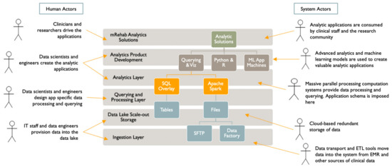 We have organized the data lake and analytics infrastructure into layers (Figure 3). The human and system actors interacting with this infrastructure are shown in Figure 4. We based this layering on a typical enterprise data architecture with some adjustments to efficiently serve the project’s primary purposes. Our project will deliver managed data sharing, data exploration, modeling, and advanced analytics application development.