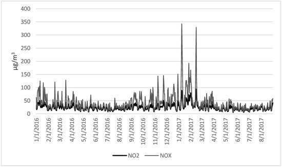 Obtained results revealed the worse quality of ambient air at the beginning of the 2017 year, with the highest NOx and NO2 concentration in the period from the 07 to 11 January (Figure 1). Similarly, daily PM2.5 concentration was the highest in the same period; detailed data on air quality were presented in a previous publication [2]. Obtained data confirmed the occurrence of two winter smog episodes in the study period, both of them were in January (4–7 January 2016 and 7–11 January 2017) in which the average temperature of ambient air was the lowest. Moreover, the median (and IQR) value of pollutants concentrations were the highest in the winter season (from 21 December to 19 March), with the following values: 44 (49.0) µg/m3 for PM2.5 and 52.58 (53.22) µg/m3 for PM10, 41 (46.9) µg/m3 for NOx and 28.7 (16.9) µg/m3, respectively.